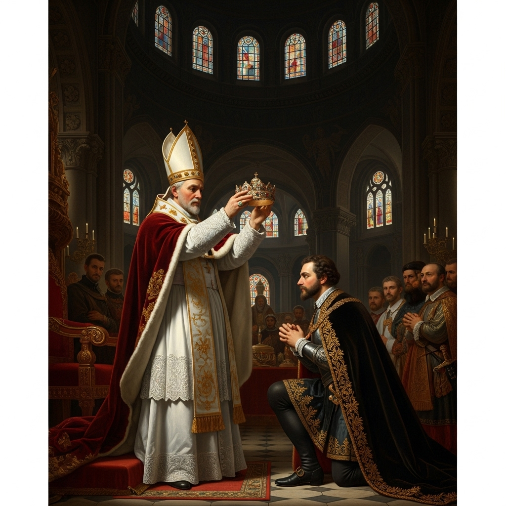 8세기 말, 프랑크 왕국의 카롤루스(샤를마뉴) 대제는 서유럽의 많은 지역을 통일하며 강력한 제국을 건설했습니다. 그는 광대한 영토를 정복하고, 기독교를 확산시키며, 학문과 문화를 장려하여 서유럽에 새로운 활력을 불어넣었습니다. 800년 크리스마스, 로마의 성 베드로 대성당에서 교황 레오 3세는 카롤루스 대제에게 황제의 관을 씌워주었습니다. 이는 멸망했던 서로마 제국의 부활을 상징하는 사건이자, '신성 로마 제국(Holy Roman Empire)'의 탄생을 알리는 순간이었습니다.