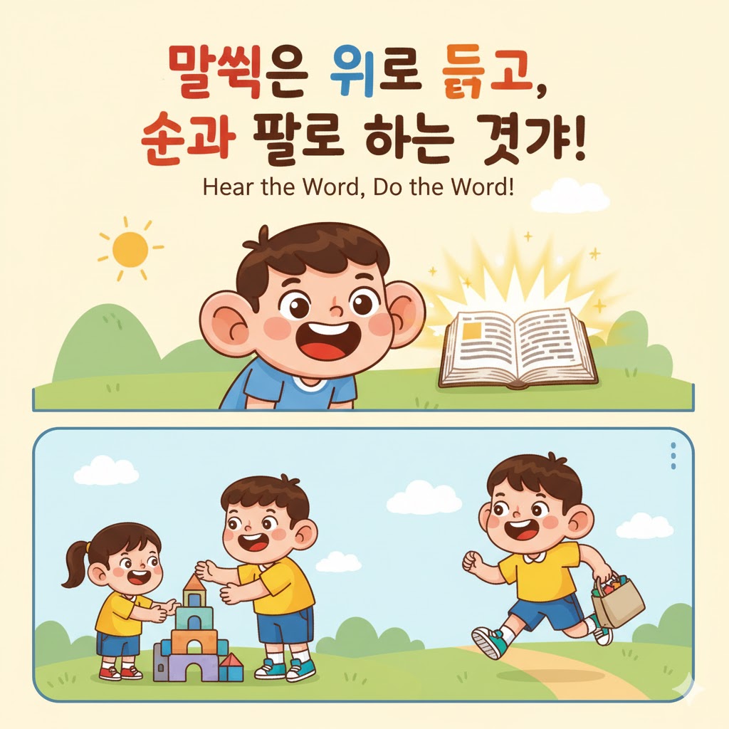 목표: 우리 친구들이 하나님의 말씀을 단순히 귀로 듣는 것에 그치지 않고, 실제로 착한 행동으로 실천하며 자신을 속이지 않는 어린이가 됩니다.